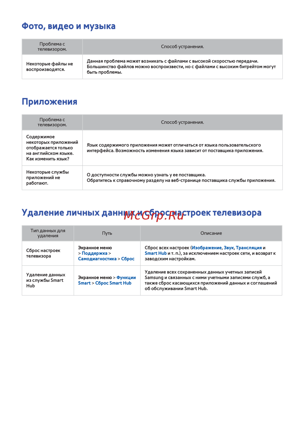 - Удаление личных данных и сброс настроек телевизора p.200