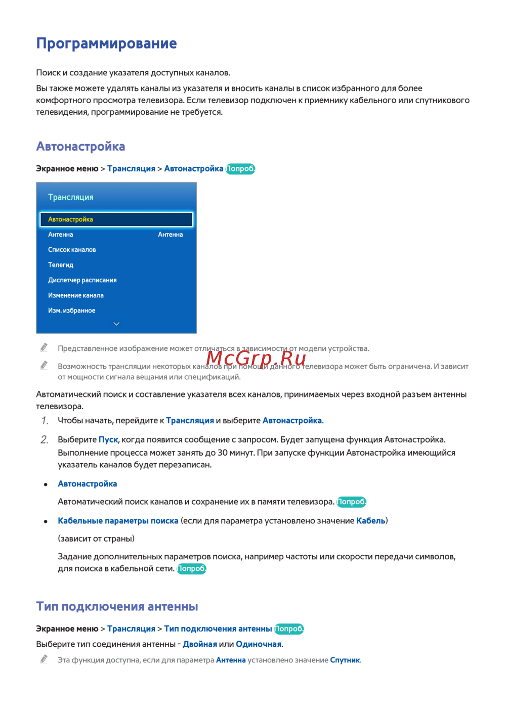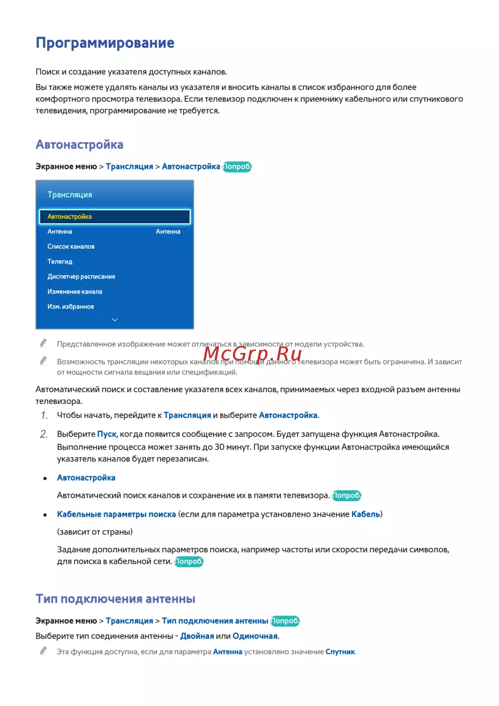 - Подключение к эфирному кабельному спутниковому источнику сигнала p.194