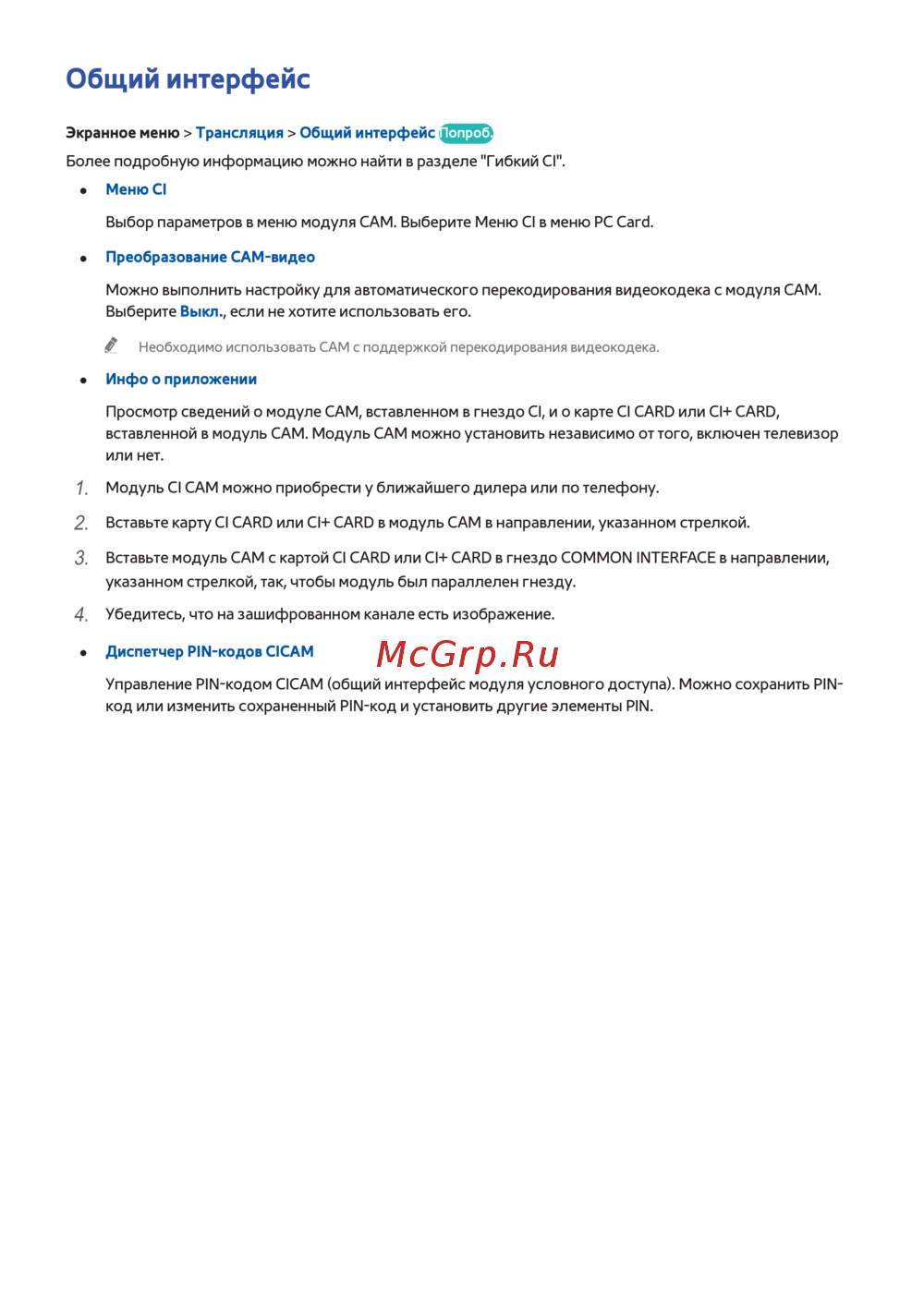 Узнайте, как настроить общий интерфейс и модуль CAM для трансляции. Получите информацию о настройках, установке и управлении PIN-кодами.