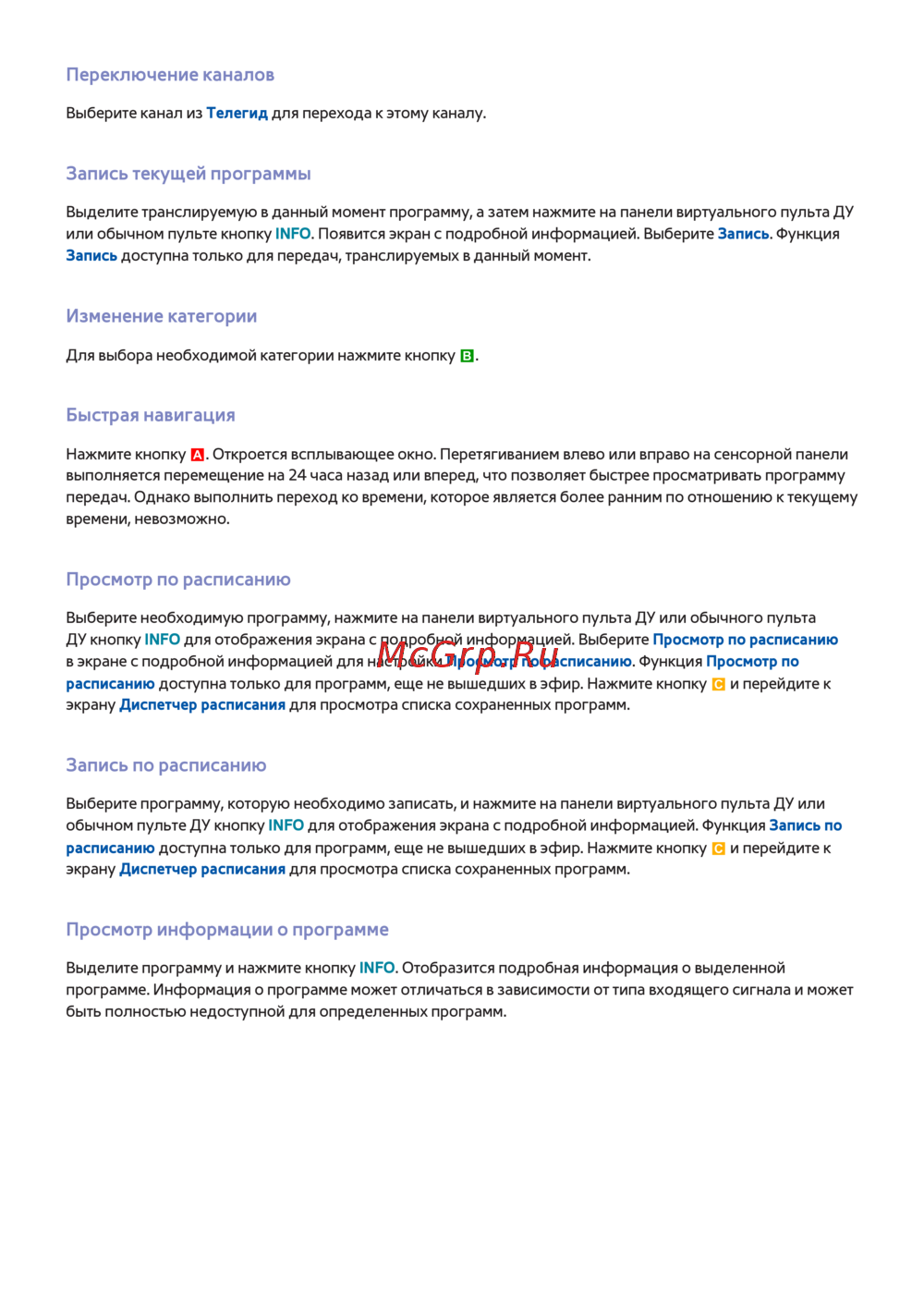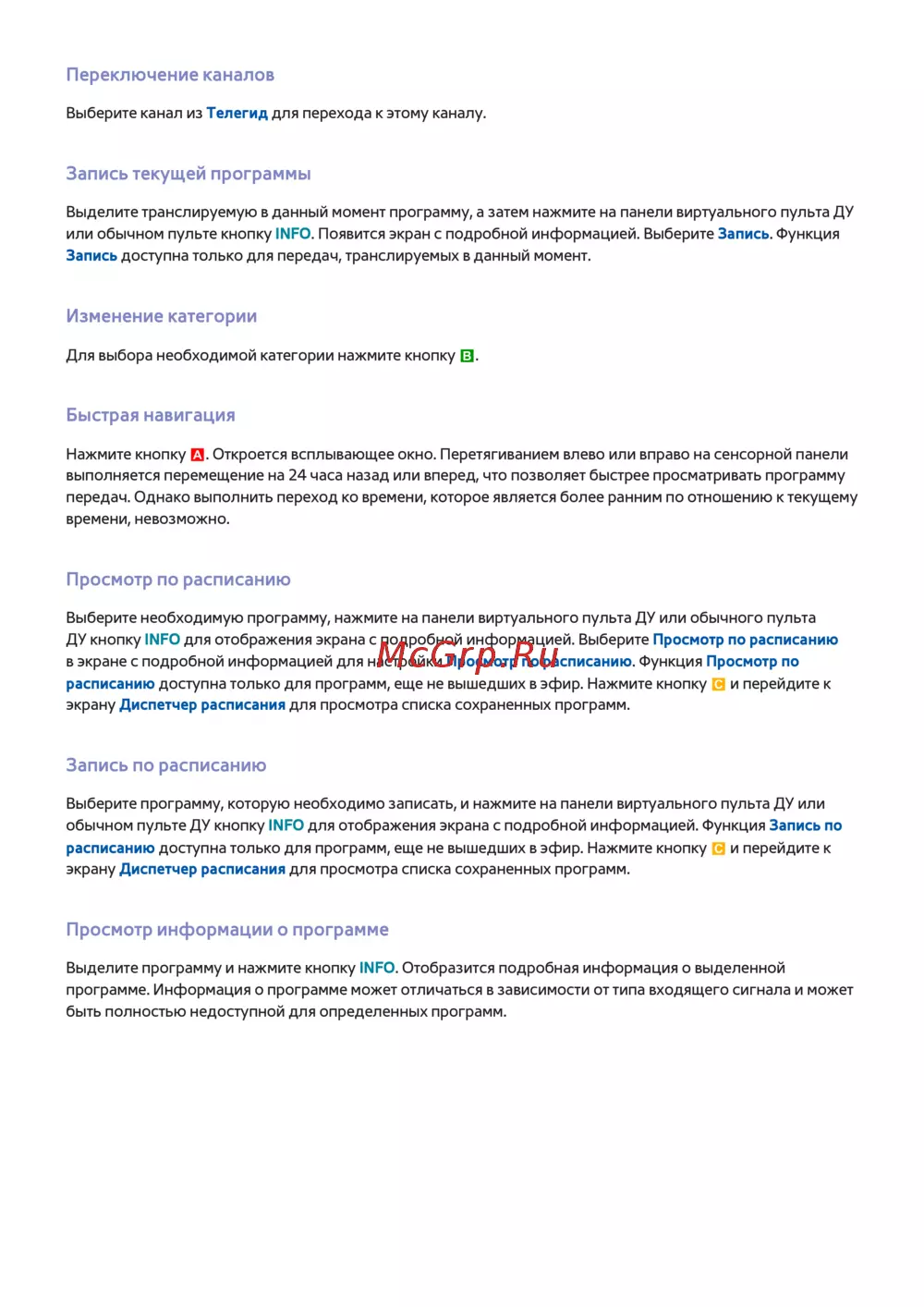 обычном пульте ДУ кнопку INFO для отображения экрана с подробной информацией. Функция Запись по