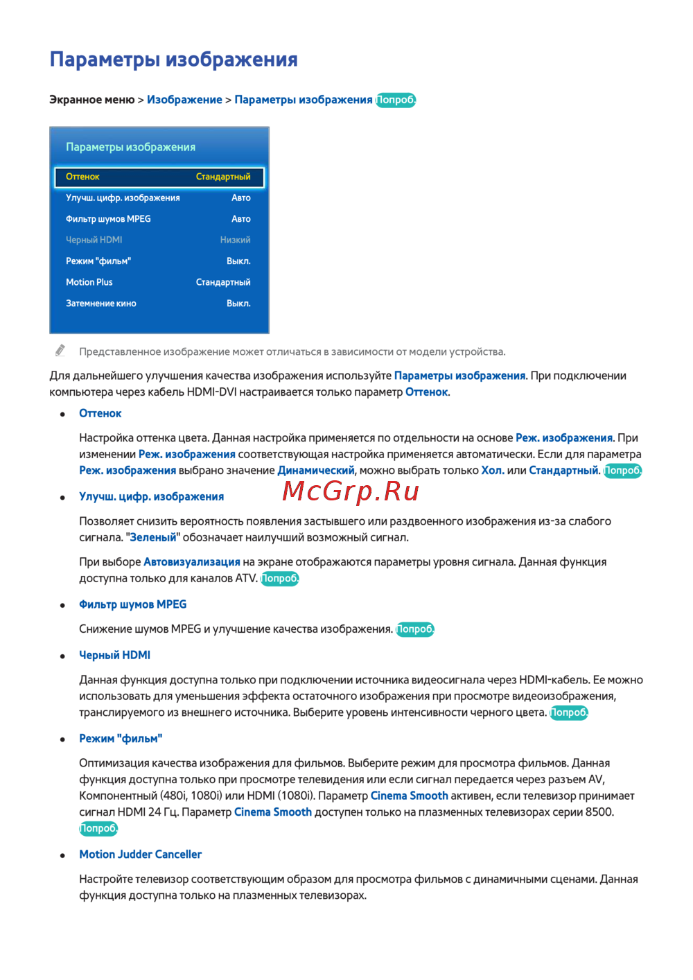 сигнал HDMI 24 Гц. Параметр Cinema Smooth доступен только на плазменных телевизорах серии 8500.