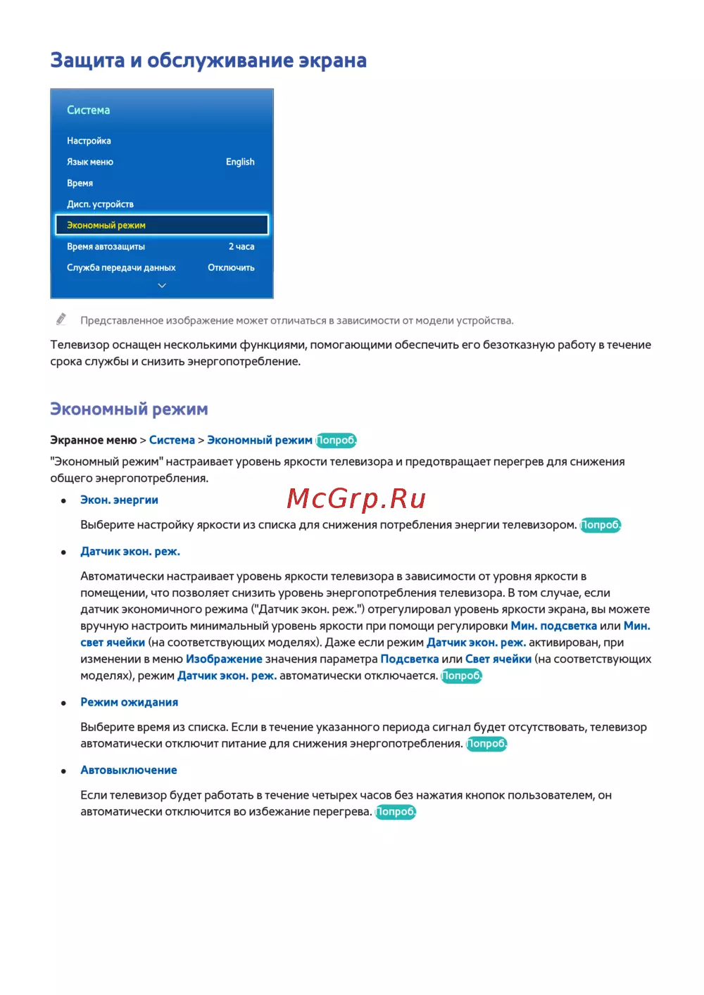 "Экономный режим" настраивает уровень яркости телевизора и предотвращает перегрев для снижения