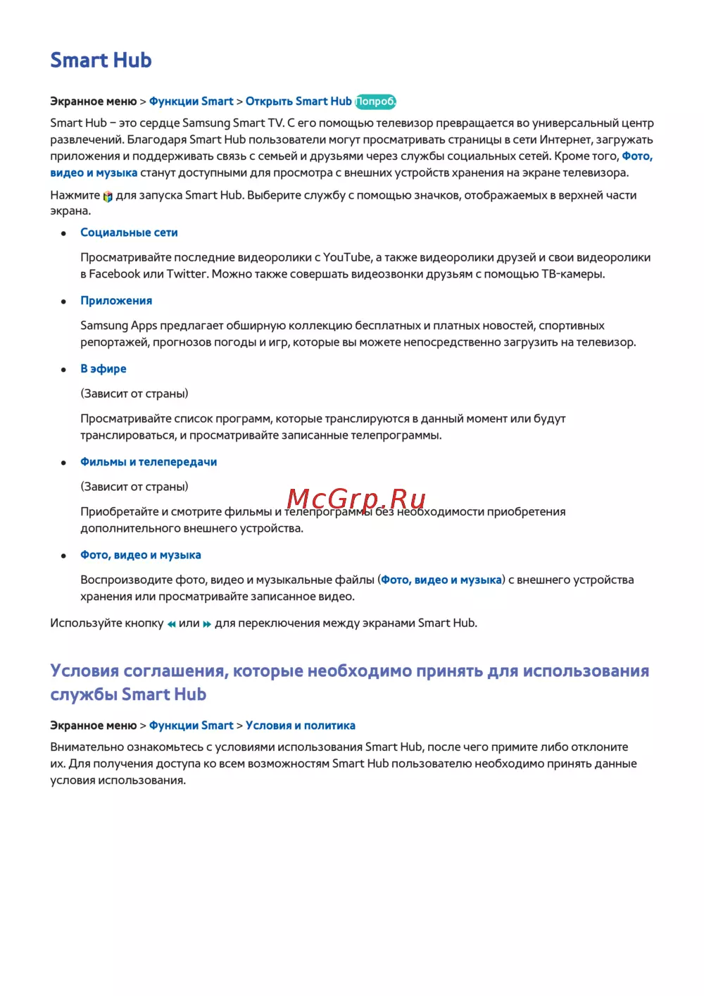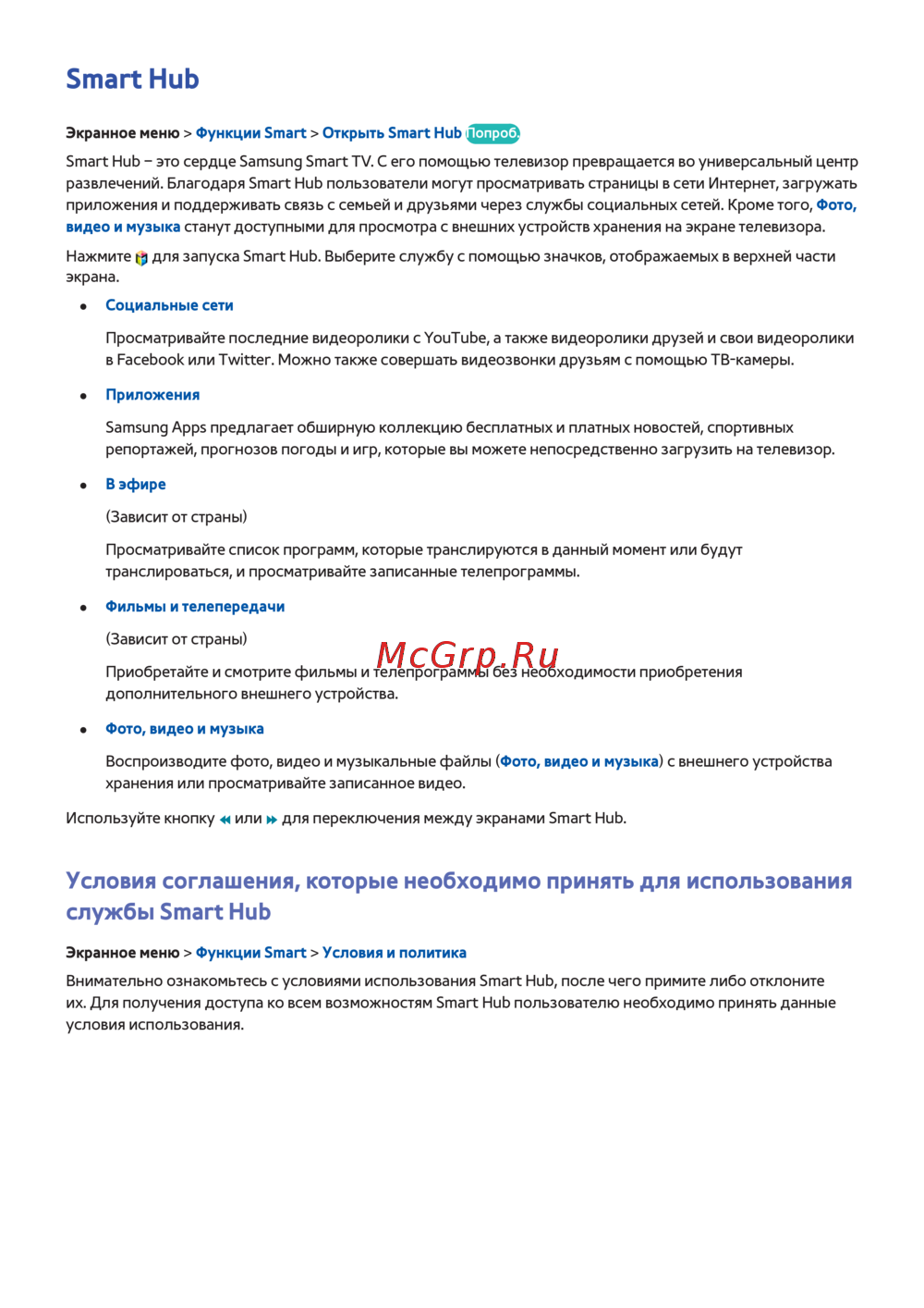 развлечений. Благодаря Smart Hub пользователи могут просматривать страницы в сети Интернет, загружать