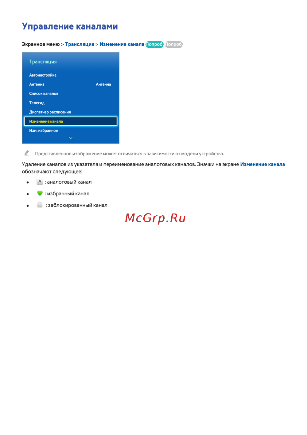 Удаление каналов из указателя и переименование аналоговых каналов. Значки на экране Изменение канала