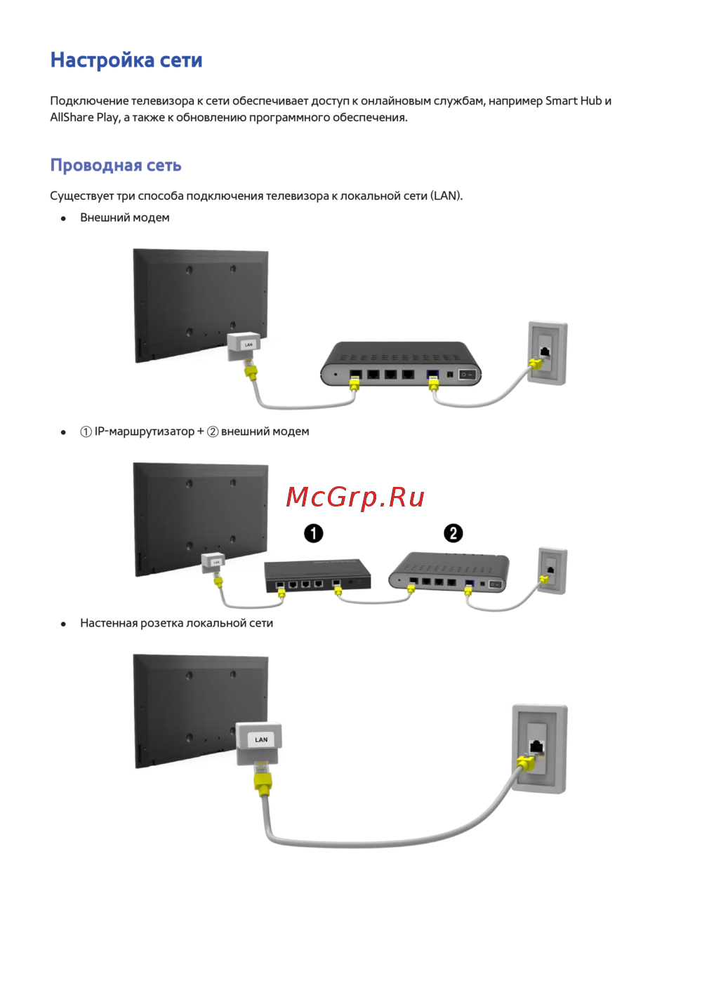 Существует три способа подключения телевизора к локальной сети (LAN).