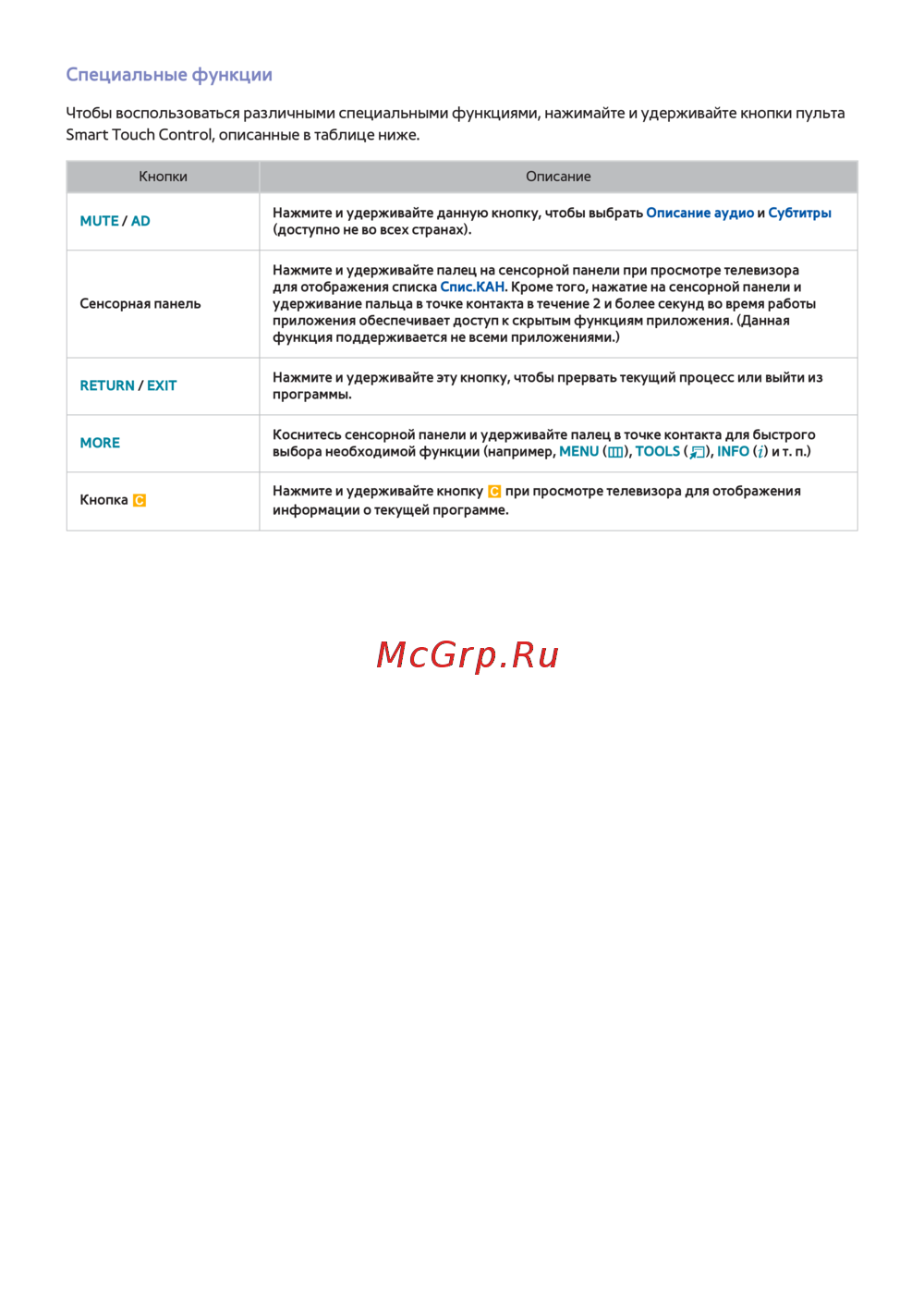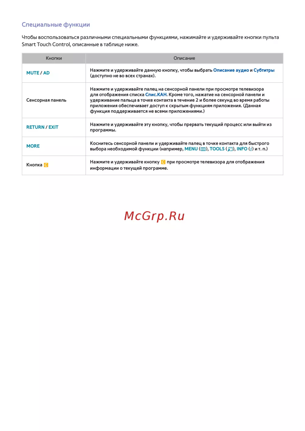 Smart Touch Control, описанные в таблице ниже.