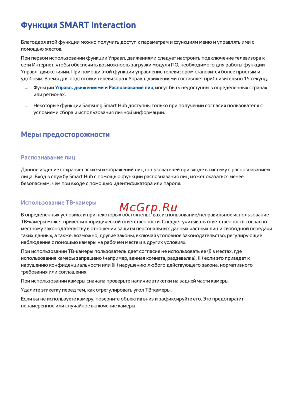 При использовании ТВ-камеры пользователь дает согласие не использовать ее (i) в местах, где