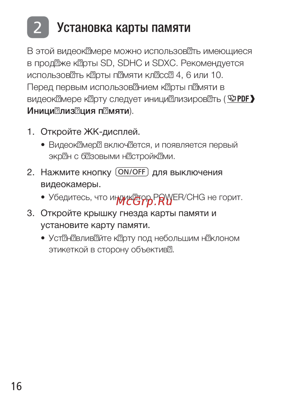 - Установка карты памяти p.16