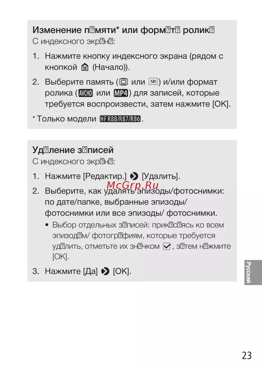 Canon LEGRIA HF R806 — инструкция по изменению памяти и удалению записей [23/29]