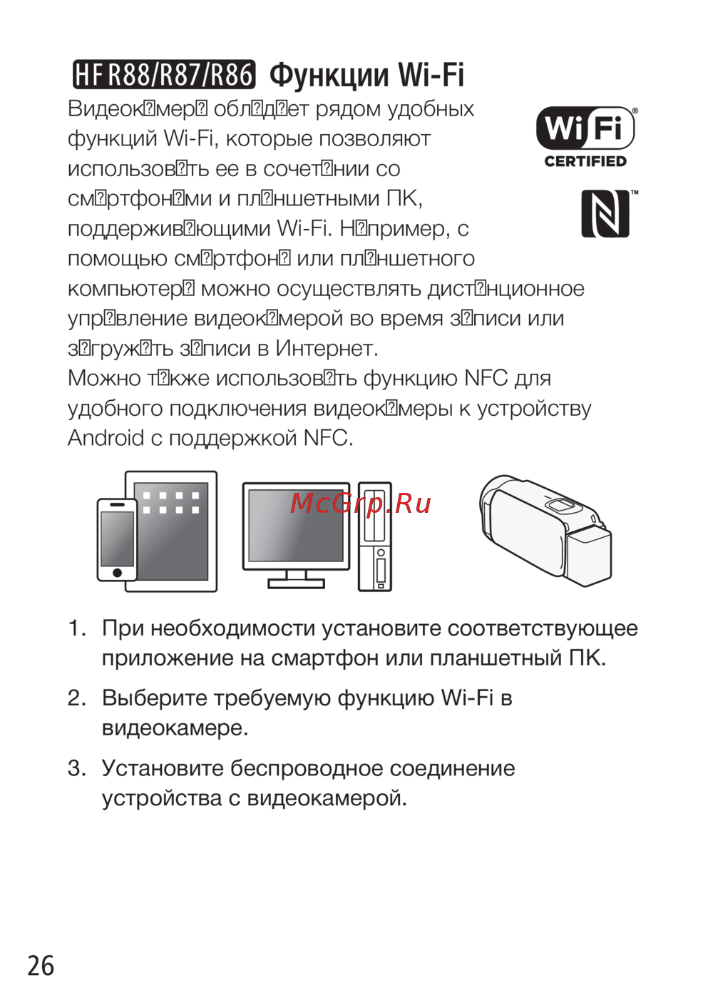 Изучите функции Wi-Fi видеокамер, позволяющие управлять записью с помощью смартфонов и планшетов. Узнайте о подключении через NFC и настройках.