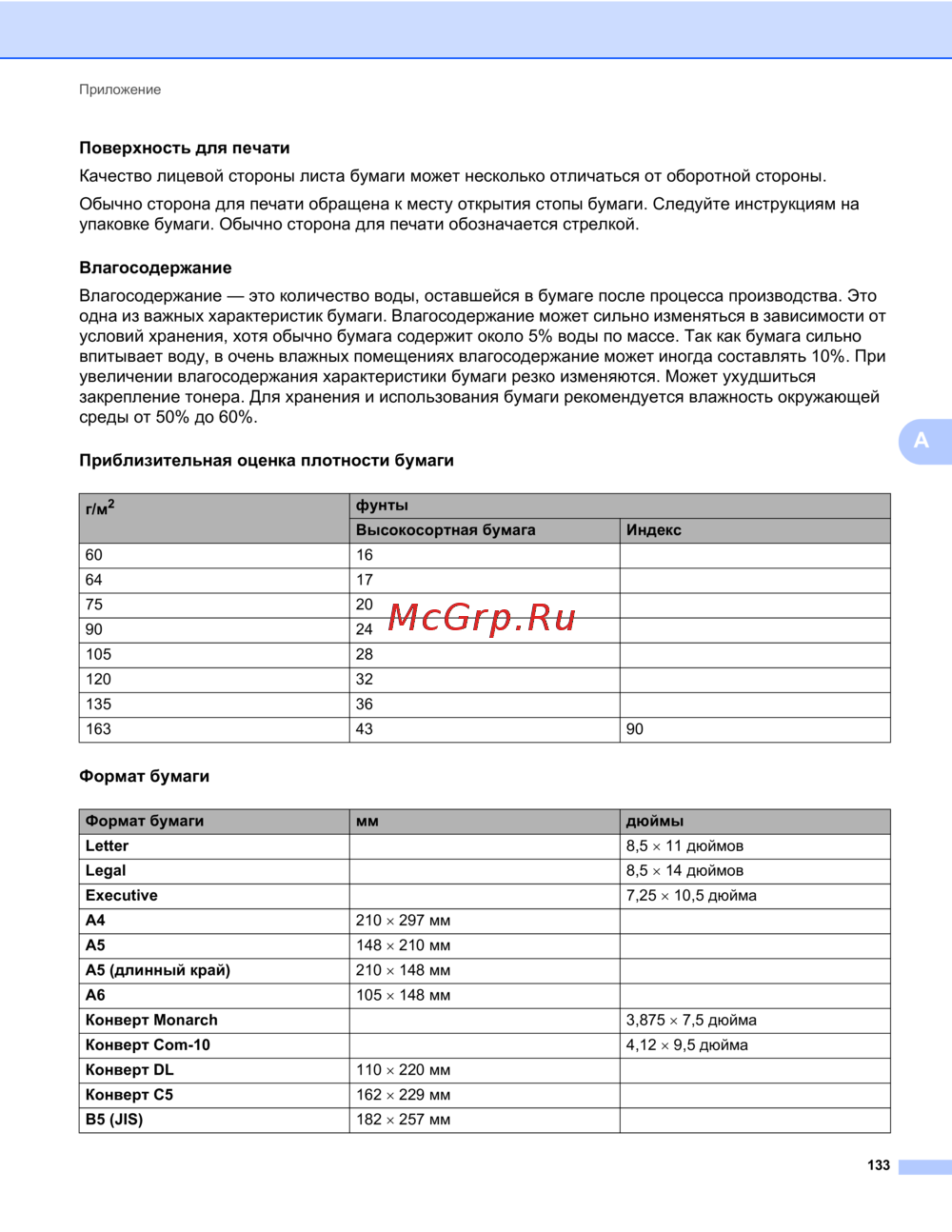 Brother HL-2130R — характеристики бумаги: качество, влагосодержание и форматы [137/154]