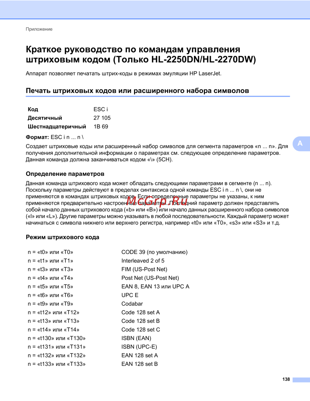 - Краткое руководство по командам управления штриховым кодом только hl 2250dn hl 2270dw p.142