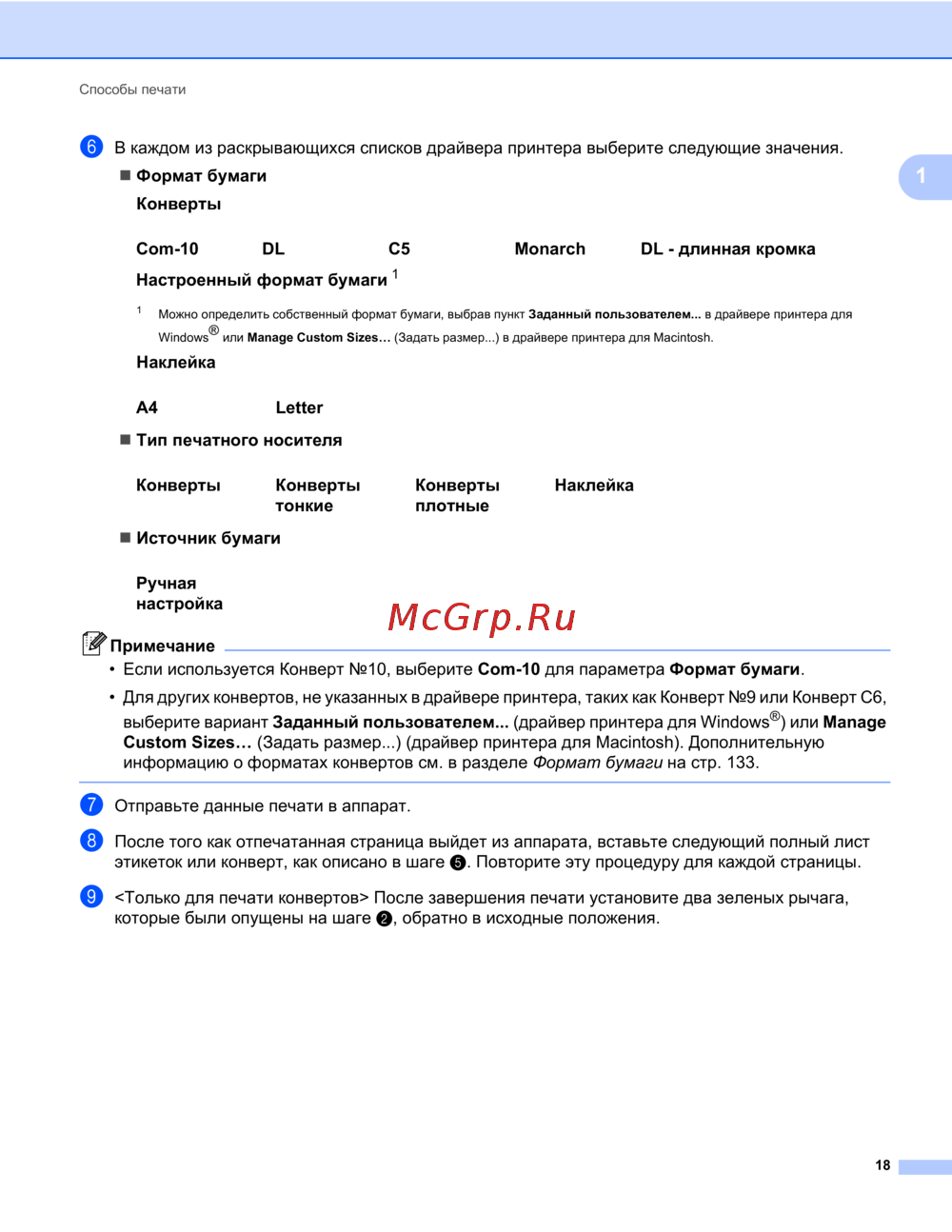 • Для других конвертов, не указанных в драйвере принтера, таких как Конверт №9 или Конверт C6,