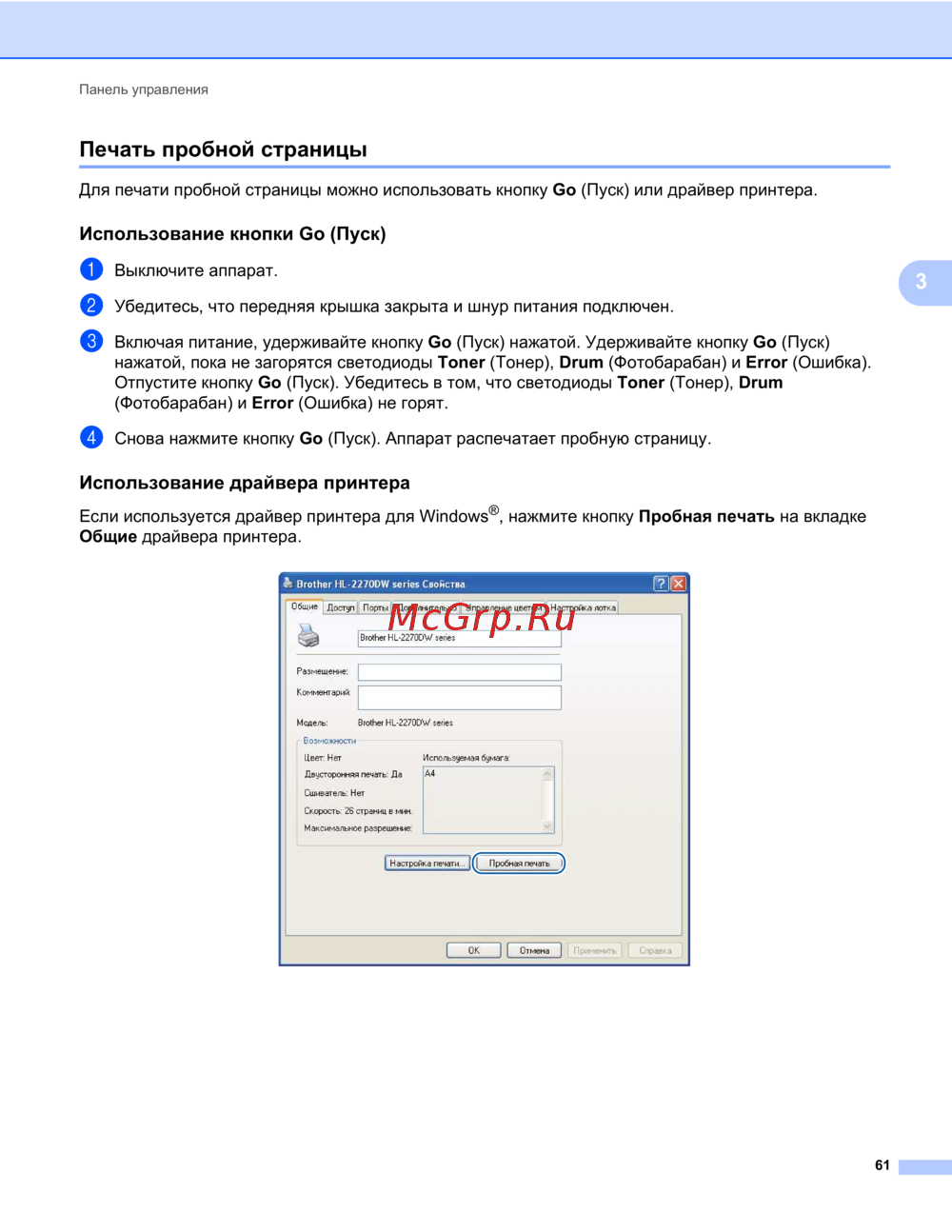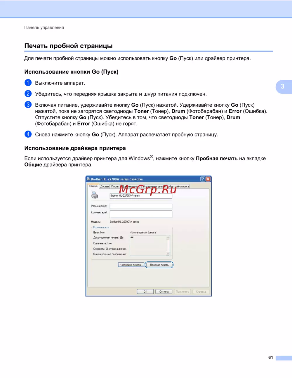 Для печати пробной страницы можно использовать кнопку Go (Пуск) или драйвер принтера.