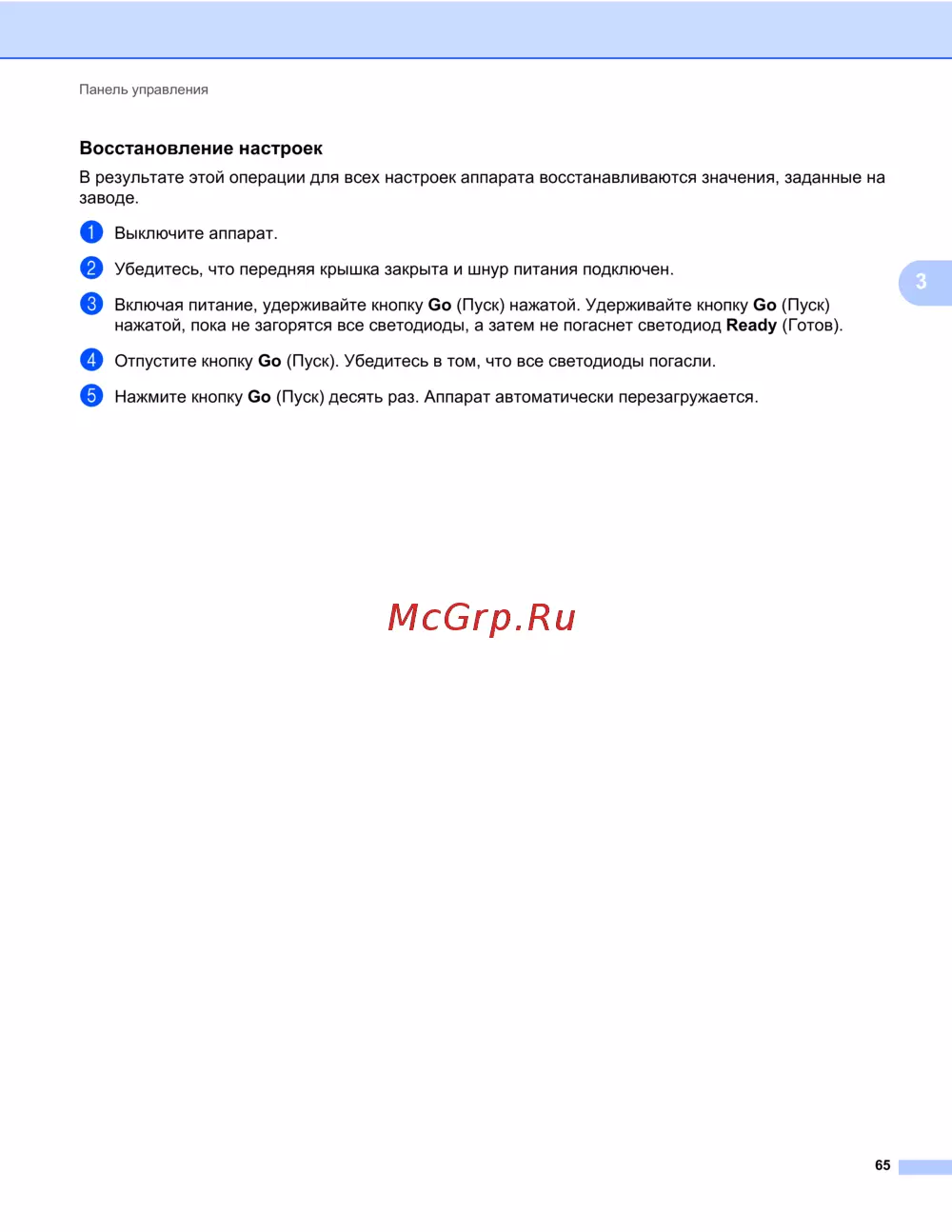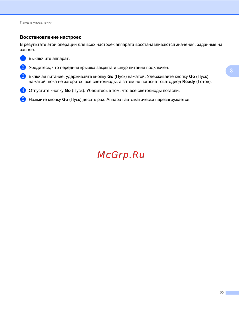 e Нажмите кнопку Go (Пуск) десять раз. Аппарат автоматически перезагружается.