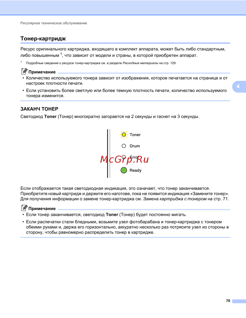 Для получения информации о замене тонер-картриджа см. Замена картриджа с тонером на стр.71.