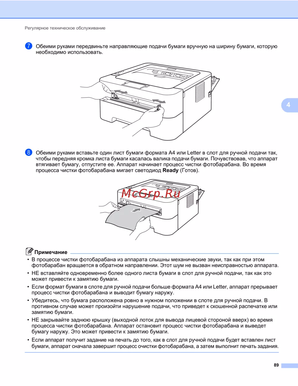 втягивает бумагу, отпустите ее. Аппарат начинает процесс чистки фотобарабана. Во время