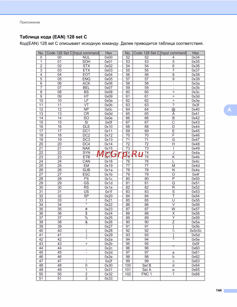 - Код ean 128 set c описывает исходную команду далее приводится таблица соответствия p.148