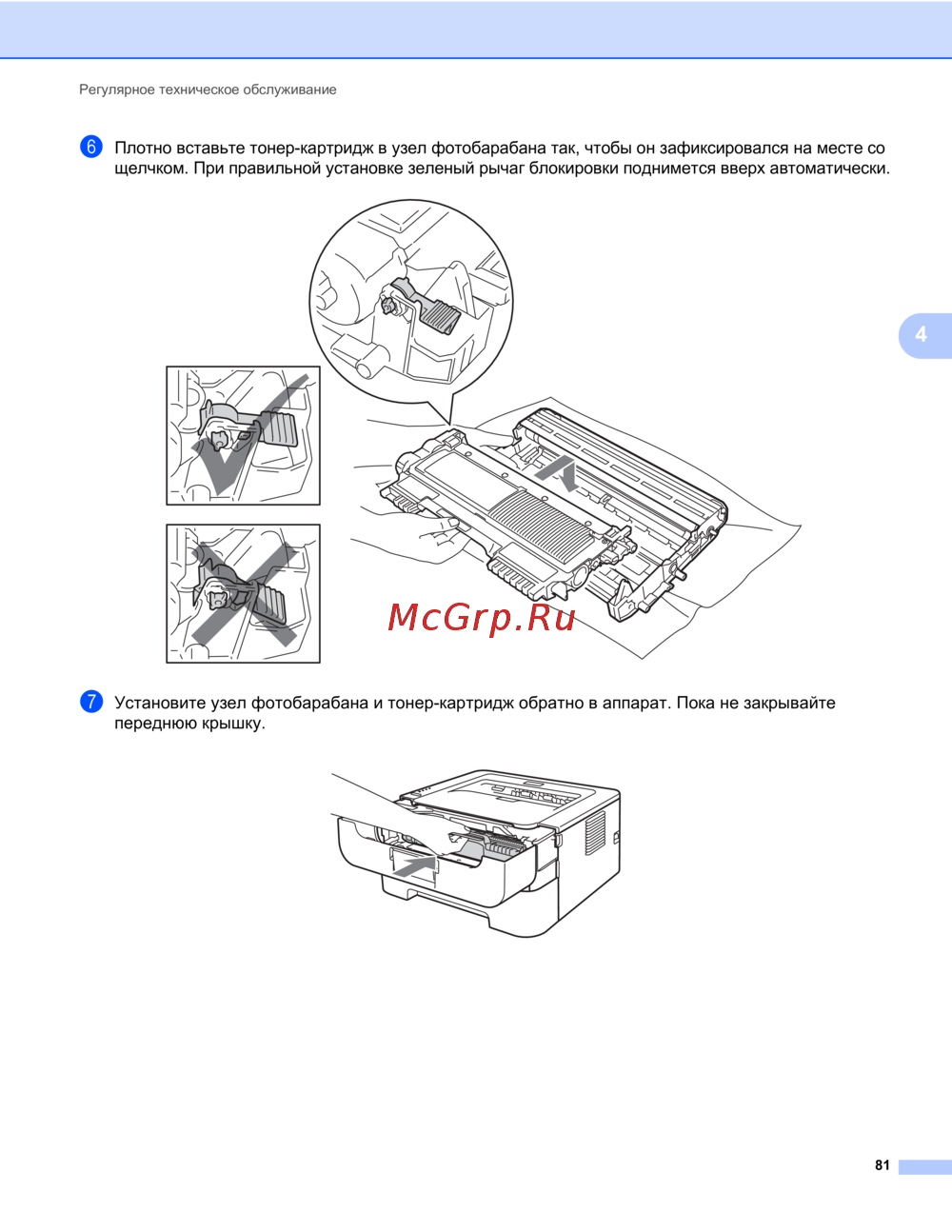 g Установите узел фотобарабана и тонер-картридж обратно в аппарат. Пока не закрывайте