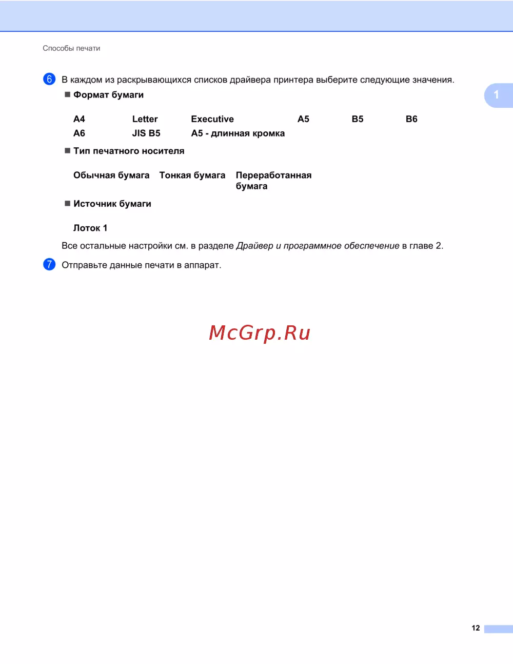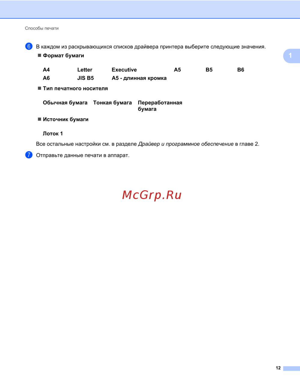 - Далее приводятся названия лотков для бумаги в драйвере принтера и данном руководстве p.8