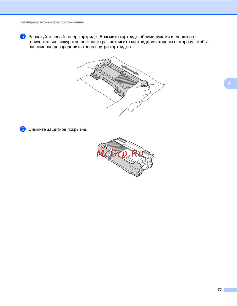 e Распакуйте новый тонер-картридж. Возьмите картридж обеими руками и, держа его