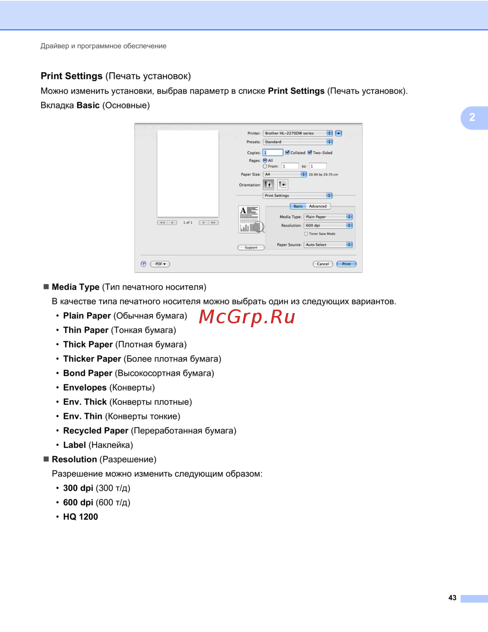 Brother HL-2242D — настройки печати: выбор типа носителя и разрешения [47/154]