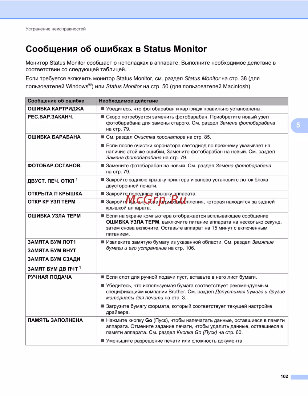 - Монитор status monitor сообщает о неполадках в аппарате выполните необходимое действие в соответствии со следующей таблицей p.106