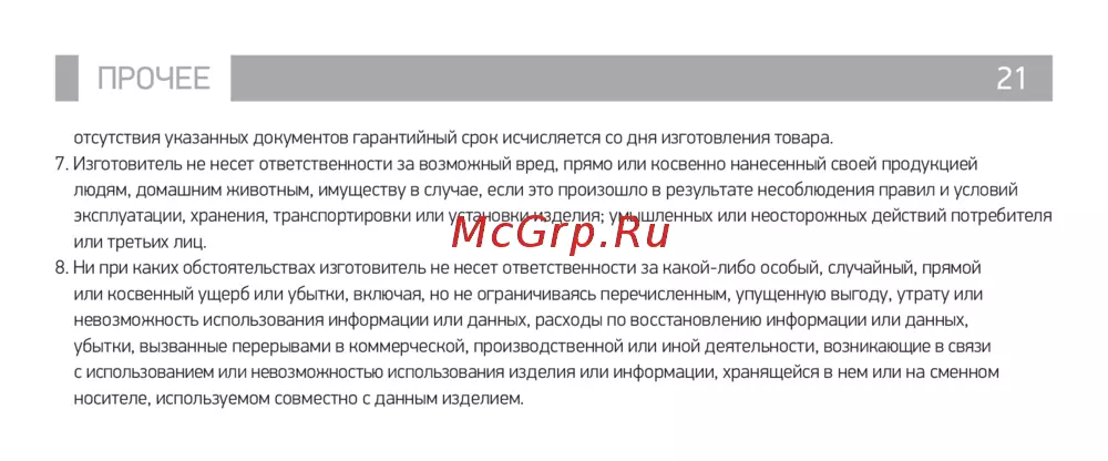 8. Ни при каких обстоятельствах изготовитель не несет ответственности за какой-либо особый, случайный, прямой