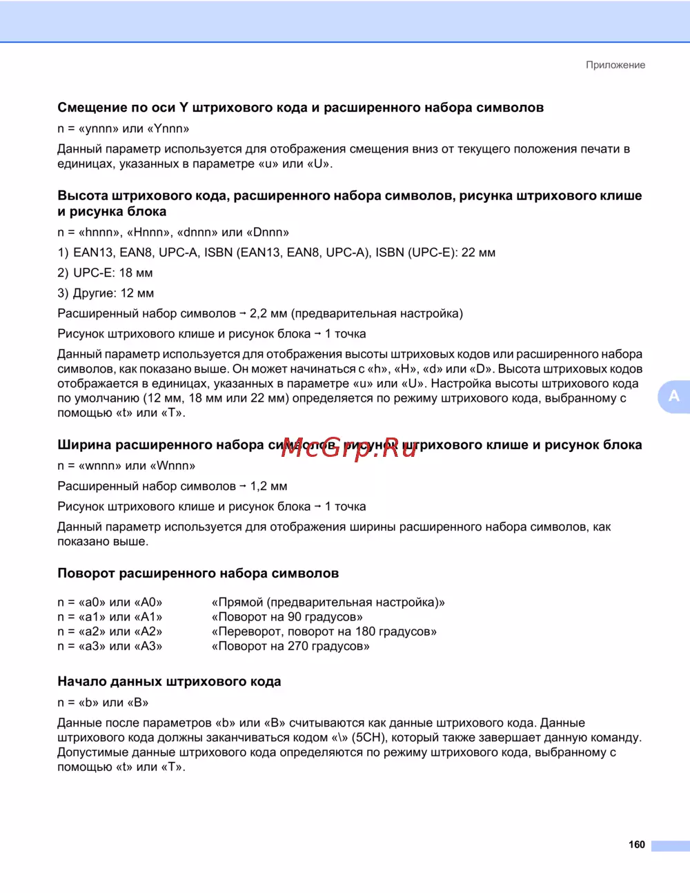 - Смещение по оси y штрихового кода и расширенного набора символов p.170