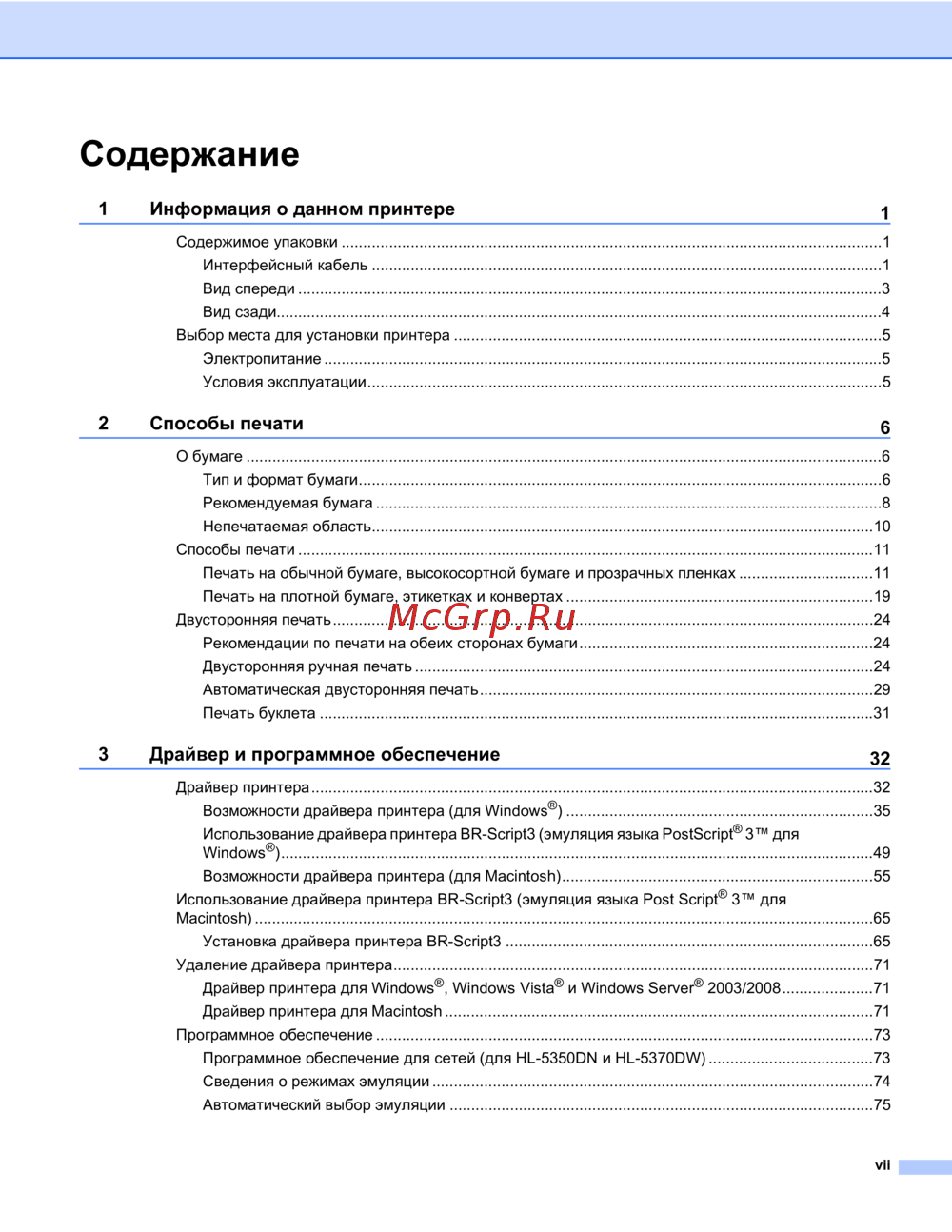 - При использовании эмуляции br script ширина области по краям бумаги на которой невозможно выполнить печать составляет 4 32 мм p.20