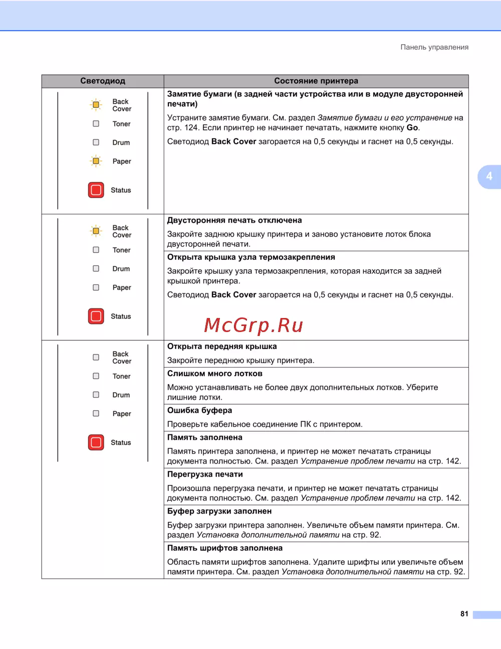 - Монитор состояния сообщит о неполадках в принтере выполните необходимое действие в соответствии со следующей таблицей p.129