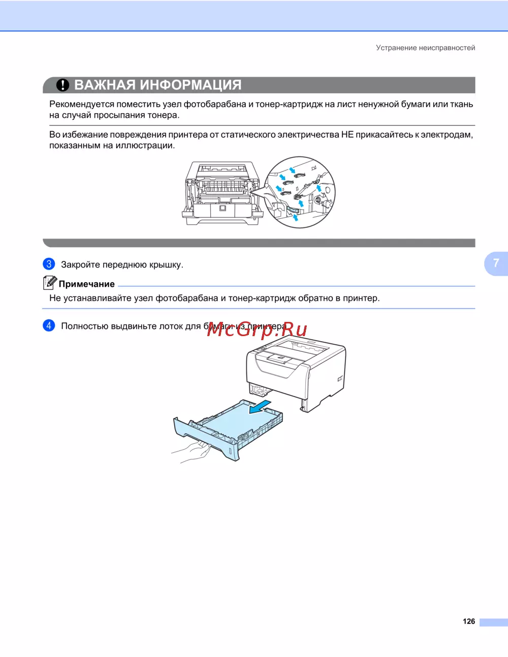 Рекомендуется поместить узел фотобарабана и тонер-картридж на лист ненужной бумаги или ткань