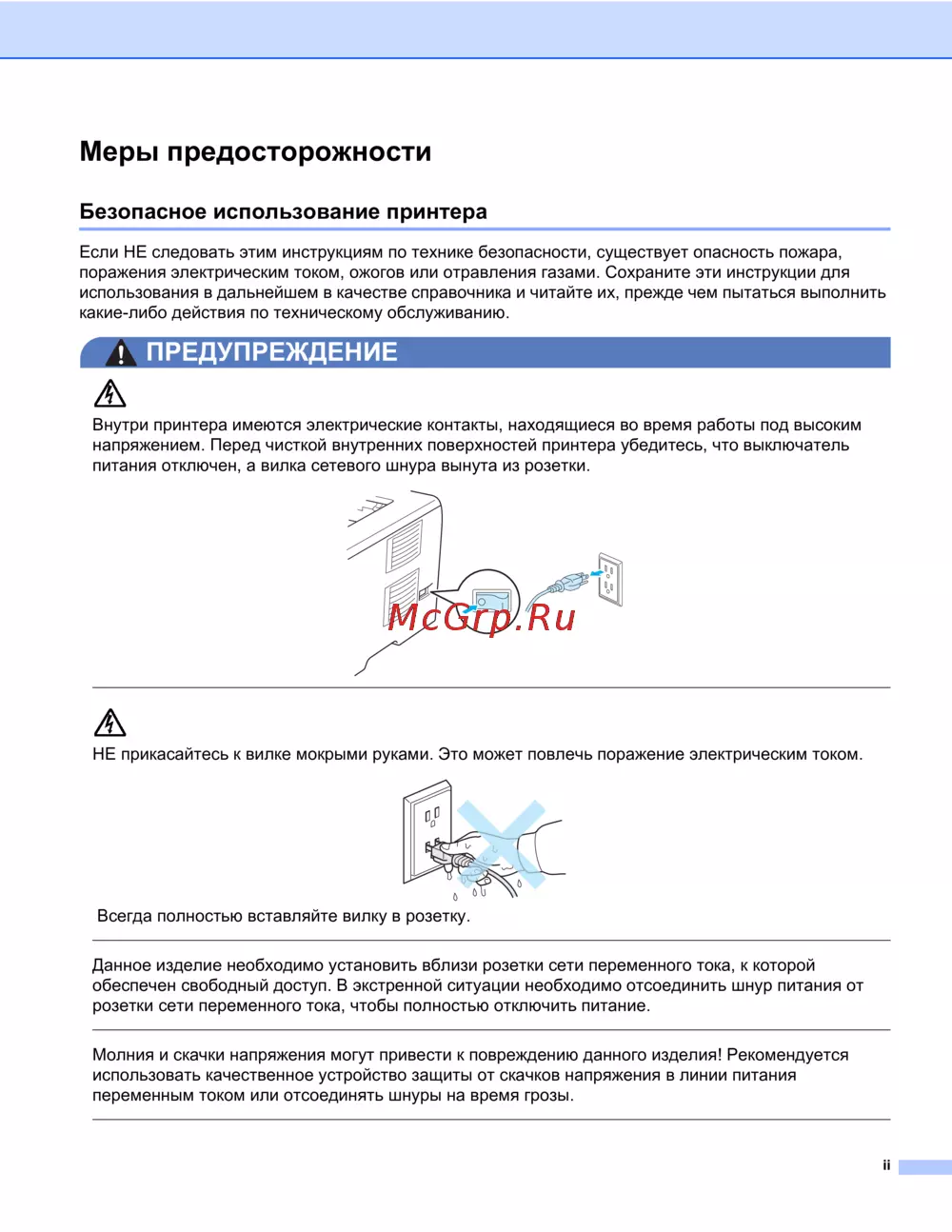 Следуйте инструкциям по технике безопасности для предотвращения пожара и поражения электрическим током. Узнайте, как правильно обслуживать принтер и избегать опасностей.