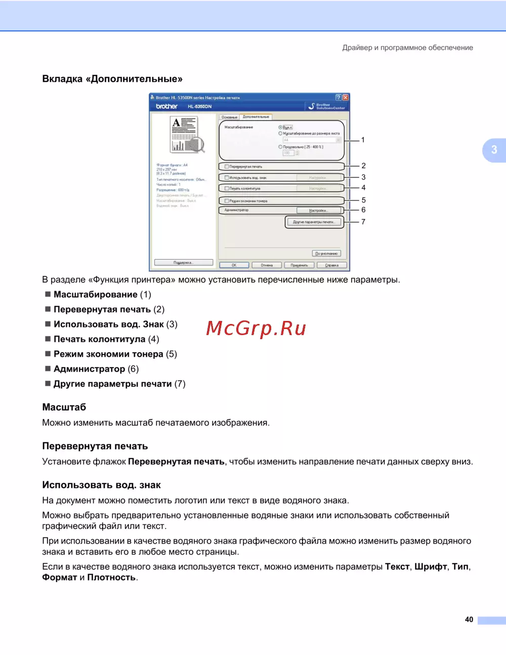 Brother HL-5350DN — настройки печати: масштабирование, водяные знаки и другие параметры [50/181]