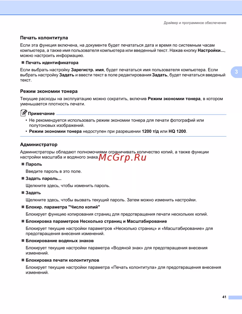 Узнайте, как настроить печать колонтитулов, режим экономии тонера и ограничения для администраторов. Оптимизируйте использование вашего устройства.