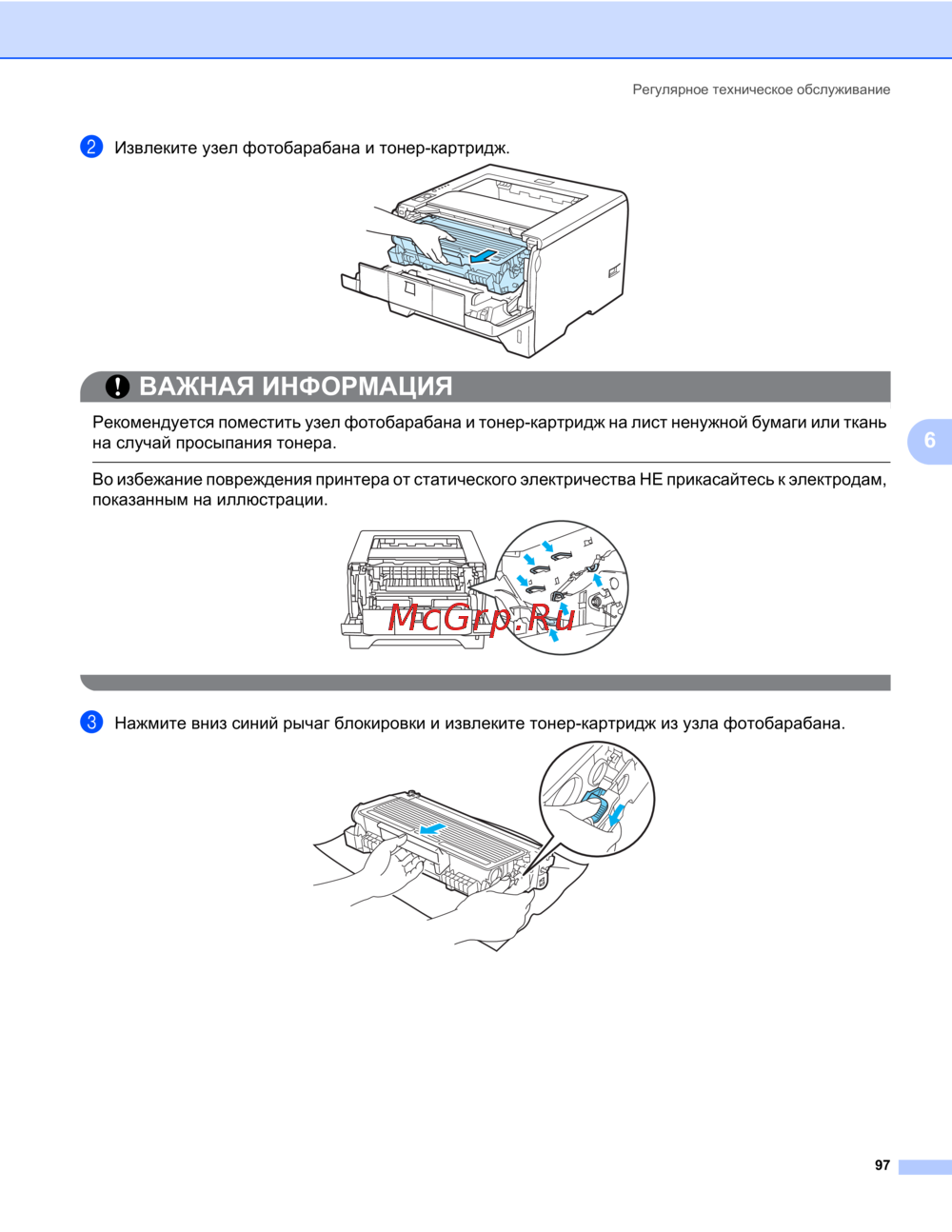 Рекомендуется поместить узел фотобарабана и тонер-картридж на лист ненужной бумаги или ткань