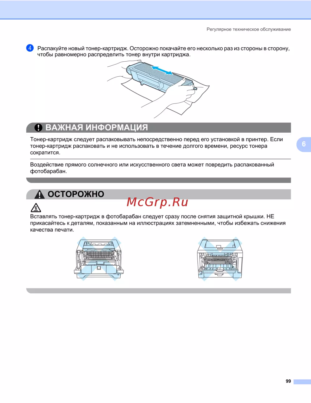 Brother HL-5370DW — правила установки и обслуживания тонер-картриджей для принтеров [109/181]