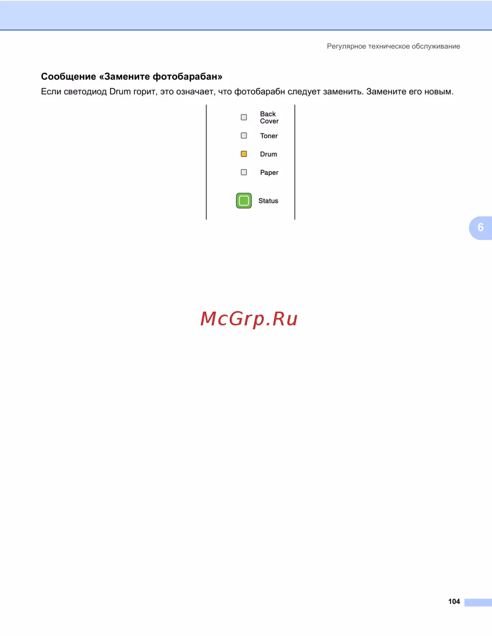 Если светодиод Drum горит, это означает, что фотобарабн следует заменить. Замените его новым.