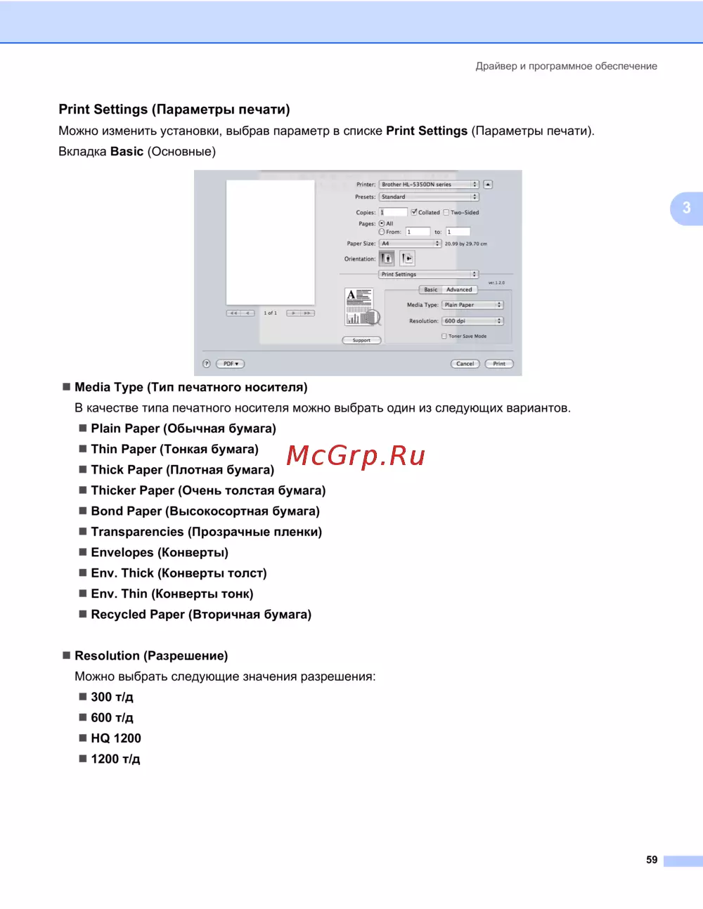 Brother HL-5370DW — настройки печати: выбор типа носителя и разрешения [69/181]