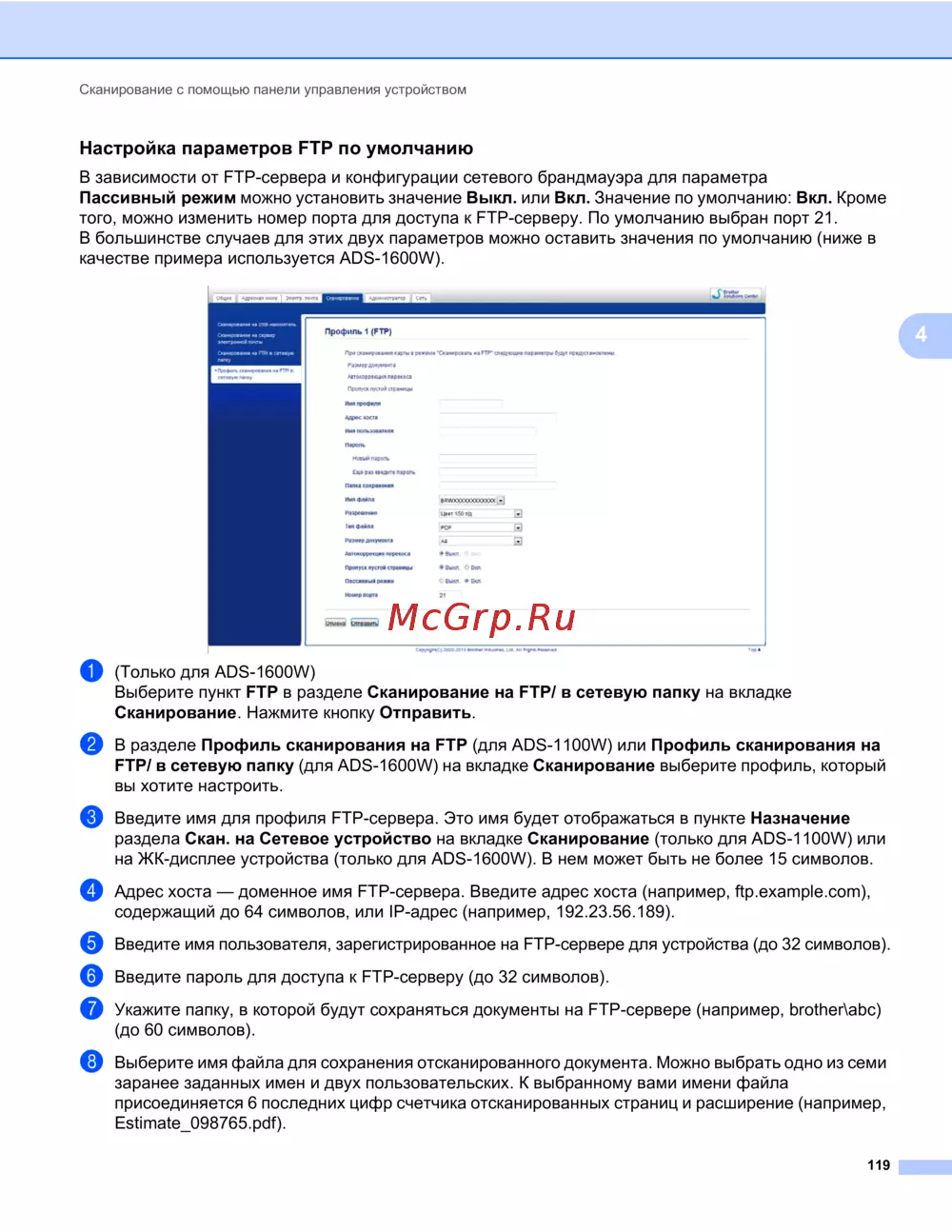 ![Brother ADS-1100W [133/252] Настройка параметров ftp по умолчанию](/views2/1250861/page133/bg85.png)