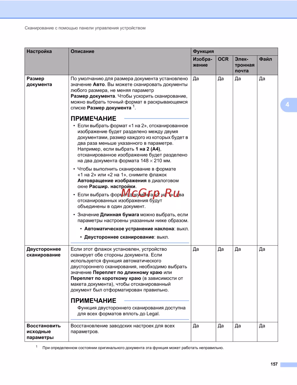 Узнайте, как правильно настроить сканирование документов, включая выбор формата, двустороннее сканирование и восстановление заводских настроек для оптимальной работы.