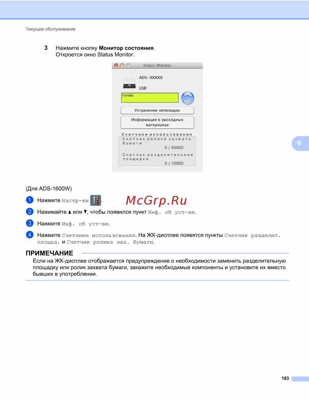 - Когда устройство определяет что срок службы расходных материалов истекает предупреждение об этом появляется в status monitor p.195