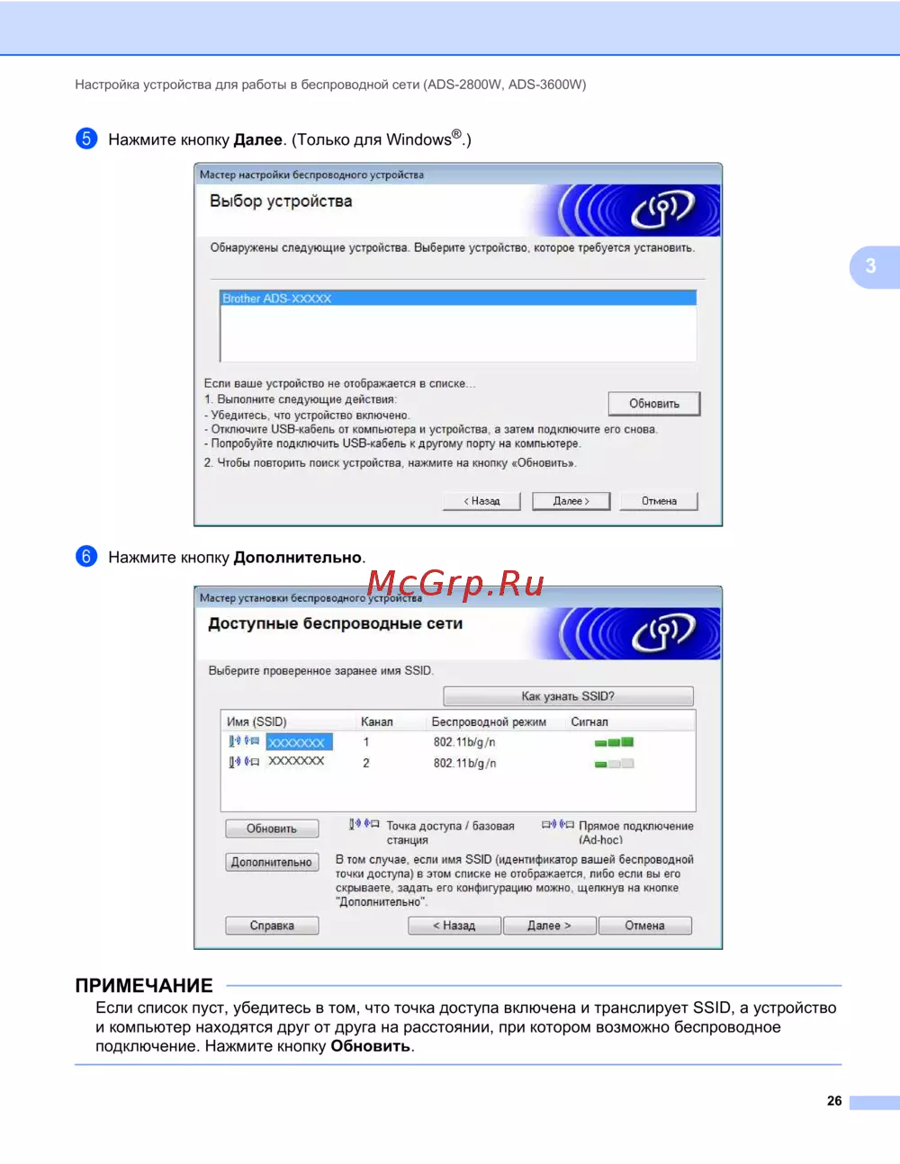 Настройка устройства для работы в беспроводной сети (ADS-2800W, ADS-3600W)