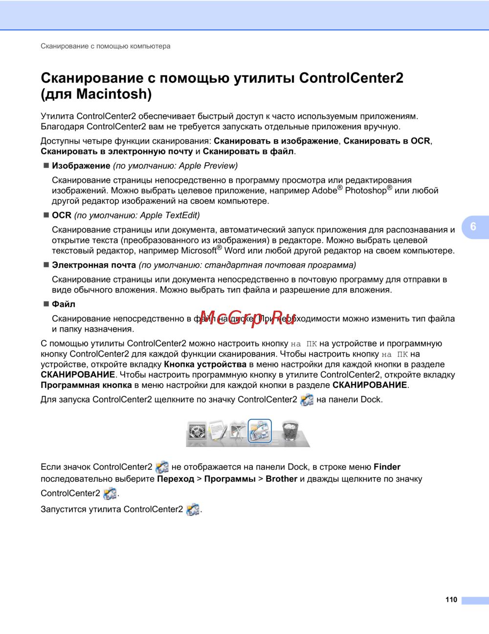 Для запуска ControlCenter2 щелкните по значку ControlCenter2 на панели Dock.