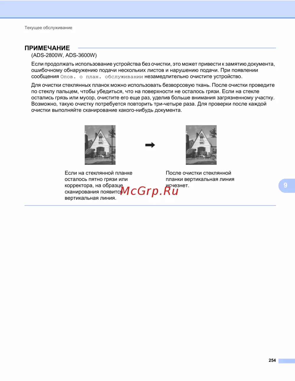 Brother ADS-2400N — обслуживание стеклянных планок принтера: важность очистки и сроки обслуживания [270/338]