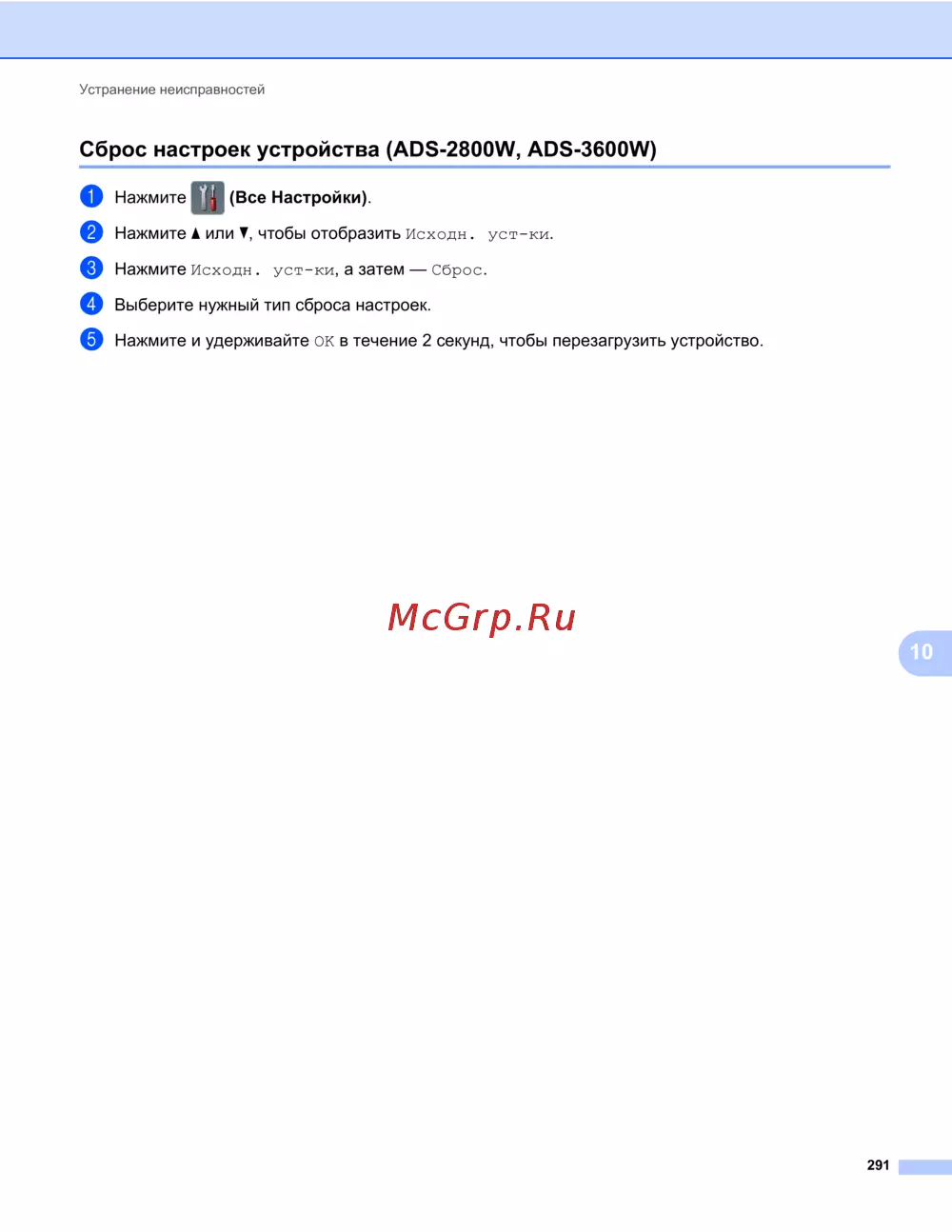 Сброс настроек устройства (ADS-2800W, ADS-3600W) 10
