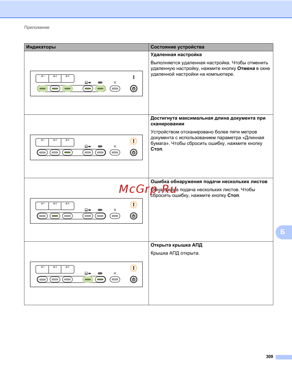 - Если после выключения и повторного включения устройства ошибка не пропадает нажмите кнопку стоп индикаторы загорятся так как показано в приведенной ниже таблице в соответствии с типом ошибки p.328