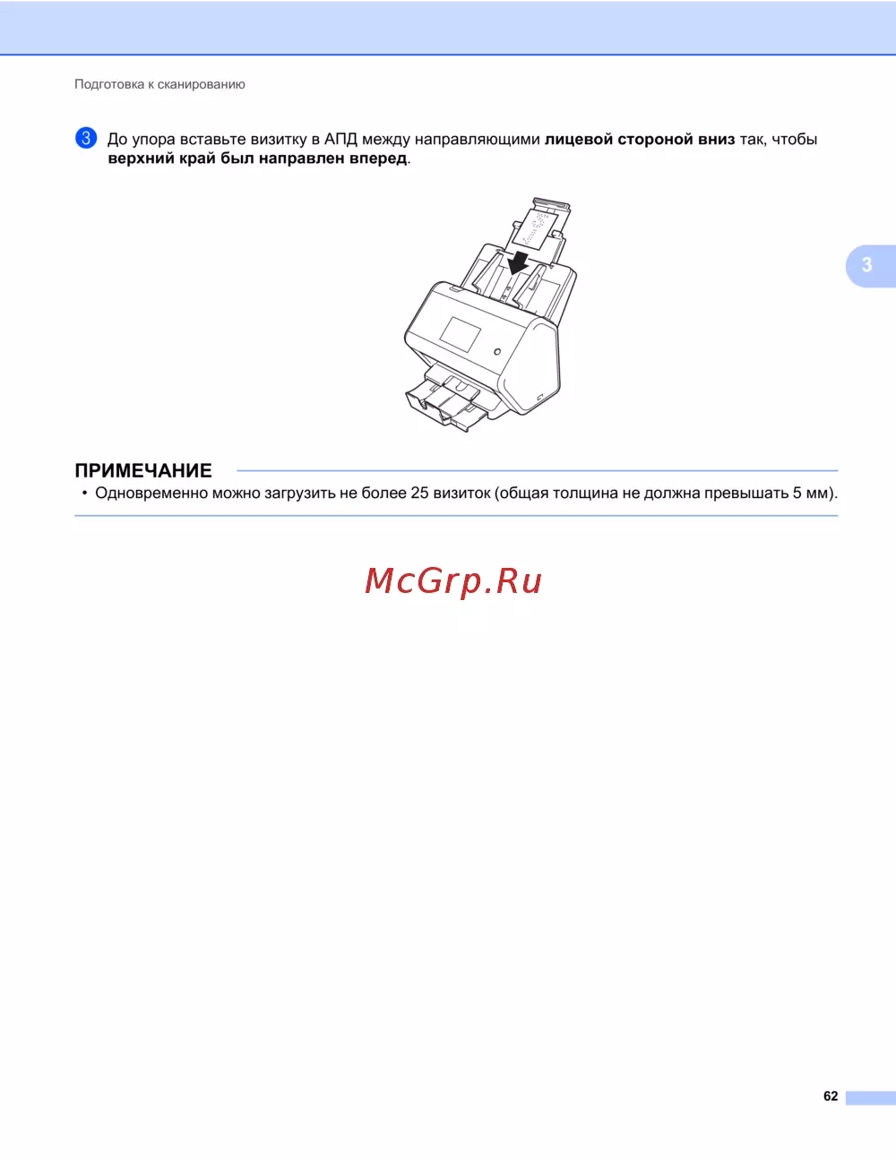 3 До упора вставьте визитку в АПД между направляющими лицевой стороной вниз так, чтобы