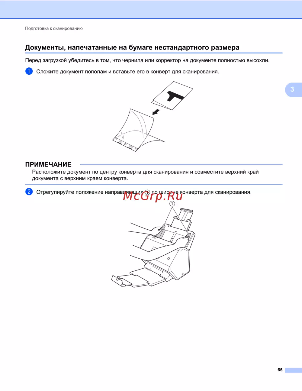 Расположите документ по центру конверта для сканирования и совместите верхний край