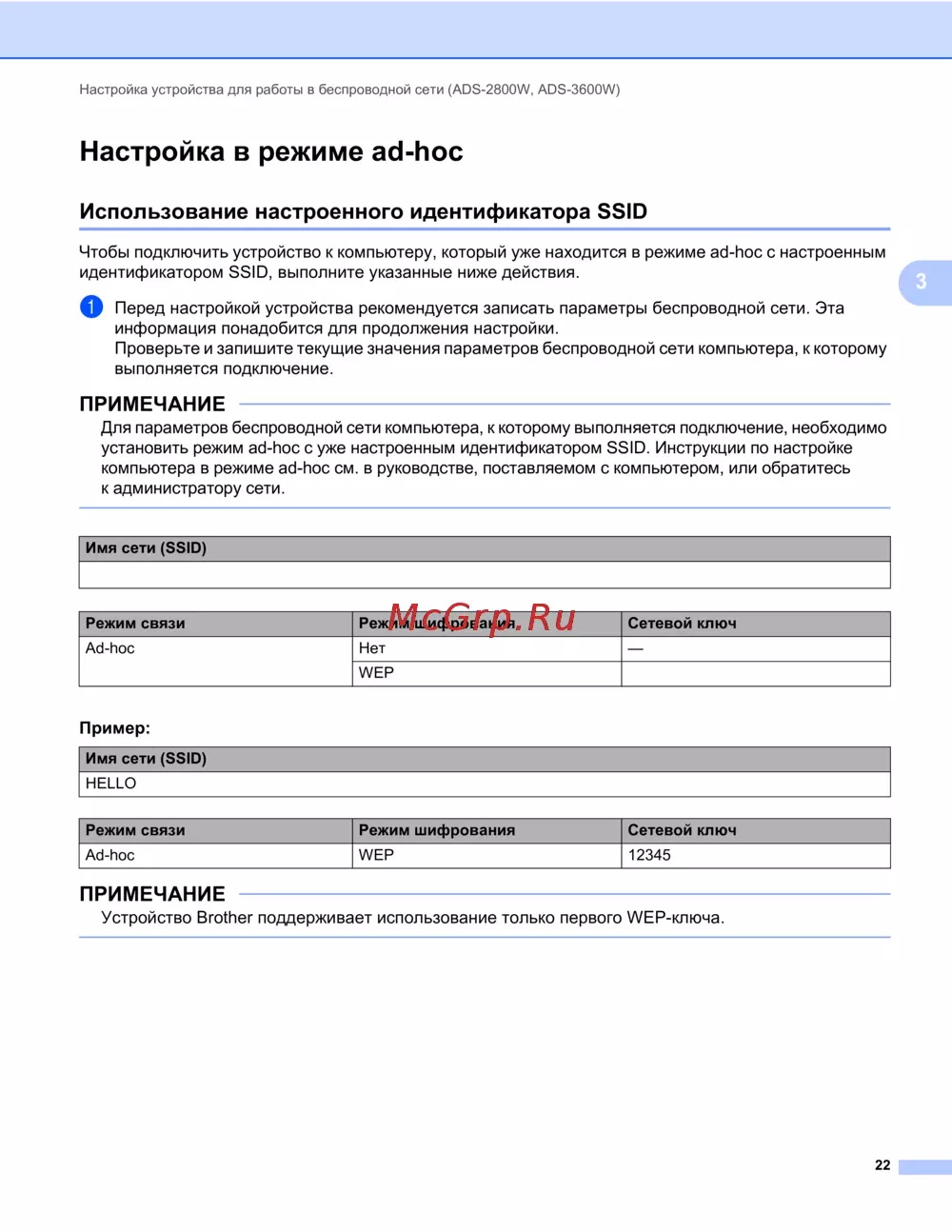 Устройство Brother поддерживает использование только первого WEP-ключа.